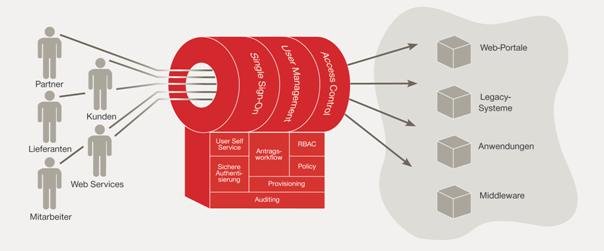 Ein durchgängiges Identity Management unterstützt Unternehmen bei der Durchsetzung unternehmensinterner Sicherheitsrichtlinien. Administration und Revision erhalten eine transparente Sicht auf alle Benutzer und ihre Berechtigungen. Zugeschnittene Profile sowie die unmittelbare Vergabe bzw. der Entzug von Berechtigungen verringern die Gefahr des missbräuchlichen Datenzugriffs. Durch SSO wird das Risiko von offen liegenden Passwörtern am Arbeitsplatz bei gleichzeitig gesteigertem Benutzer-Komfort minimiert.